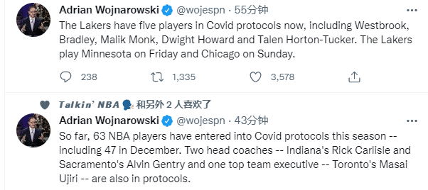 据ESPN名记沃纳罗斯基报道,截至目前,本赛季已经有63名NBA球员进入了健康安全协议,仅12月份就新增47名球员。此外步行者主帅卡莱尔和国王主帅金特里,以及猛龙队总经理乌杰里都查出阳性确诊新冠;国王队疫情泛滥,除了金特里,巴格利和泰伦斯-戴维斯也中招,阳性且出现症状,国王立即关闭球馆。