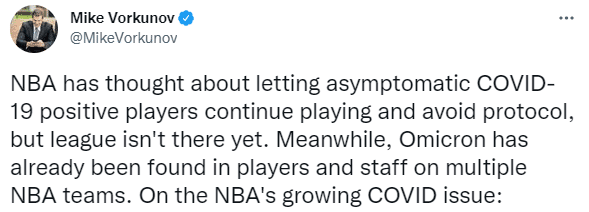 NBA疫情泛滥并且已经出现奥密克戎变体病例,但NBA并不计划停摆,据名记Mike Vorkunov报道,NBA正考虑让无症状阳性球员继续参加比赛,不过联盟还没做出最终的决定。