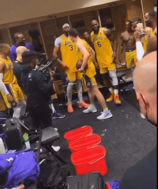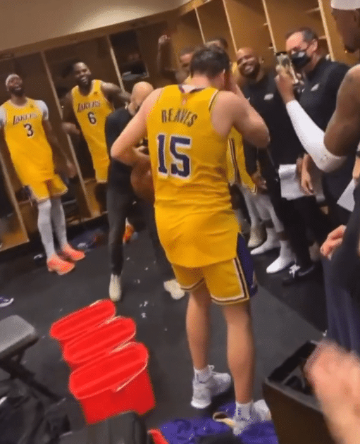 在湖人更衣室里,里夫斯刚走进门,詹姆斯第一时间把比赛用球扔给里夫斯,小乔丹躲在门口,把一大桶水都浇在里夫斯的头上,詹姆斯和浓眉等人围着里夫斯跳舞庆祝,老詹全程面带笑容,为小弟绝杀而开心;赛后詹姆斯表示为里夫斯绝杀感到自豪和兴奋。
