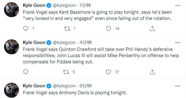 谈到队内多位球员触发健康与安全协议,沃格尔表示:我们有许多有能力的球员,所以我们预计会完成工作。沃格尔还表示,全队100%接种了疫苗,也遵循健康与安全协议的指导规则行事,球队也在鼓励球员接种加强针疫苗,除了蒙克、霍华德和塔克,其他球员都没事。
