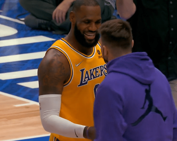 之后詹姆斯轰进三分球,半场9投5中、三分4中3拿到15分,中场休息时,詹姆斯拥抱东契奇,两人拥抱有说有笑。