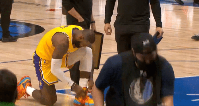 来源:JRS直播网12-16 11:09JRS直播网12月16日讯 ,NBA常规赛湖人客场对阵独行侠,即将37岁的詹姆斯在第二节遭遇惊险一幕,突破上篮时不幸崴脚倒地,老詹捂着脚踝十分痛苦,独行侠趁机反击,所幸詹姆斯伤势无碍,活动脚踝之后系紧鞋带继续干,轻伤不下火线,三旬老汉真是太拼了。