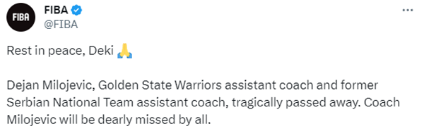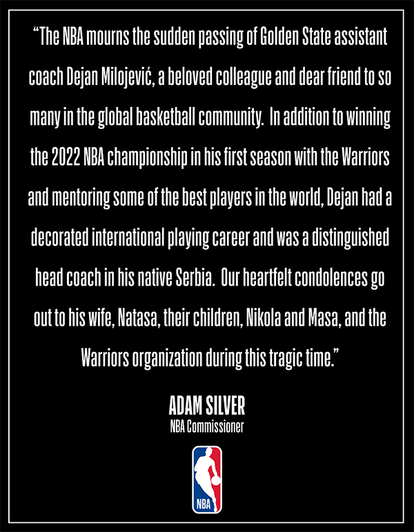 NBA官方、FIBA官方发声悼念勇士助教,联盟总裁萧华表示:NBA为金州勇士队助理教练德扬-米洛耶维奇的突然离世表达沉痛哀悼,他是备受全球篮球界诸多人士敬爱的同事和挚友。他的生涯荣誉除了加盟勇士第一年就随队夺得2022年总冠军,指导培养了一些全世界最优秀的球员之外。德扬的球员生涯也非常辉煌,在他祖国塞尔维亚,他也曾是一位杰出的主教练。在这个悲痛的时刻,我们向他的妻子娜塔莎、他的孩子们,以及勇士队表达衷心的慰问。