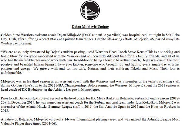勇士官方宣布噩耗,官方吊唁:勇士队助理教练德扬-米洛耶维奇昨晚在犹他州盐湖城的一次私人球队晚宴上突发心脏病,随后被送至医院。尽管竭尽全力进行挽救生命,46岁的米洛耶维奇还是在周三早晨去世了。