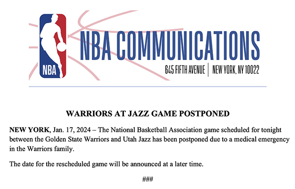 NBA官方发布声明,因勇士助教米洛耶维奇健康状况严重,勇士和爵士今日比赛被推迟。