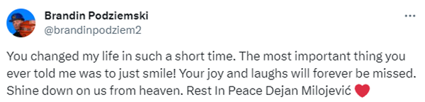 勇士球员波杰姆斯基发推写道:你在如此短的时间内改变了我的生活,你告诉过我的最重要的事就是微笑!我将永远怀念你的欢乐和笑声。从天堂照耀我们吧,安息吧米洛耶维奇。