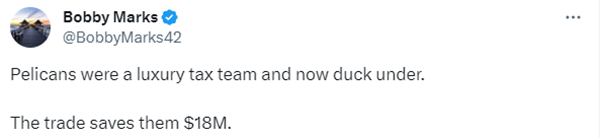 猛龙和步行者都得到自己想要的资产,鹈鹕2换0为了啥?据薪资专家Booby Marks报道,鹈鹕通过交易把总薪资将至奢侈税起征线以下,这笔操作让鹈鹕省下1800万美元。