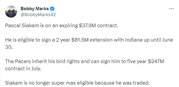 据报道,西亚卡姆对加盟步行者感到兴奋,并希望能在今年夏天与步行者签订一份新合同;步行者保留了西卡的鸟权,今年7月份,他们双方可以签下最高5年2.47亿美元大合同。西卡3790万美元的合同即将到期,他有资格在6月30日前与步行者提前签下2年8150万美元新合同。