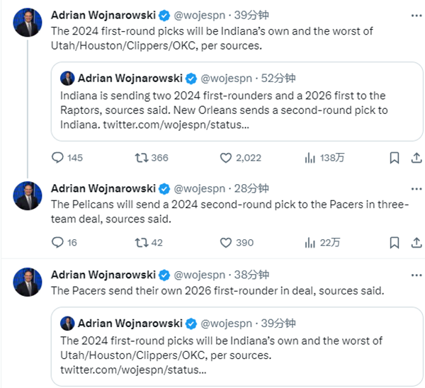 来源:JRS直播网01-18 13:22JRS直播网01月18日讯,步行者、猛龙和鹈鹕达成一笔三方大交易,西亚卡姆加盟步行者,联手哈利伯顿和特纳组成三巨头;西卡将继续身穿43号球衣,今夏有望与步行者签下5年2.47亿美元大合同;更多交易内幕曝光,哈利伯顿出面招募西卡,步行者全新13+3阵容出炉。