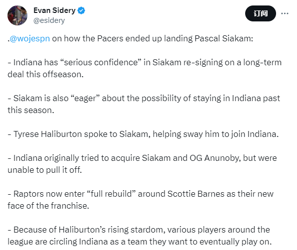 woj报道,步行者新核哈利伯顿出面招募了西亚卡姆,联盟中的许多球员都将印第安纳视为他们最终想要效力的球队。步行者曾想通过交易同时得到西卡和阿努诺比,但交易未能达成,接下来猛龙将围绕巴恩斯进行重建。