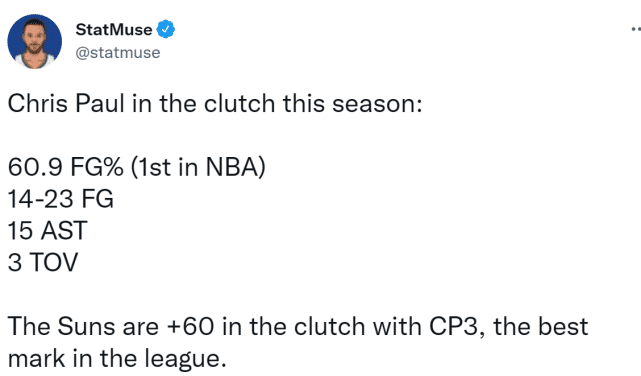 当然,保罗今天最令人印象深刻的还是他在关键时刻的表现,据美媒statmuse统计,本赛季在关键时段,也就是比赛最后5分钟分差5分以内的时段,保罗一共出手23次命中14球,60.9%的投篮命中率是全联盟所有球员在关键时刻最高的!而且送出15次助攻,只有3次失误。除此之外,保罗在关键时段一共净胜对手60分,这同样是联盟所有球员之最!