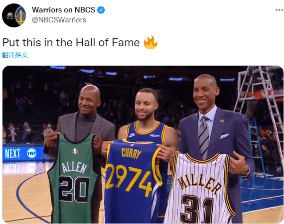赛后,库里手持纪念版球衣与雷阿伦、雷吉-米勒两大传奇合影,阿伦拿着自己穿过的20号球衣,米勒则是拿着自己的31号球衣,三大传奇神射再次同框;赛前三人有说有笑,寒暄拥抱,库里破纪录时,雷阿伦等人都起立为库里欢呼。