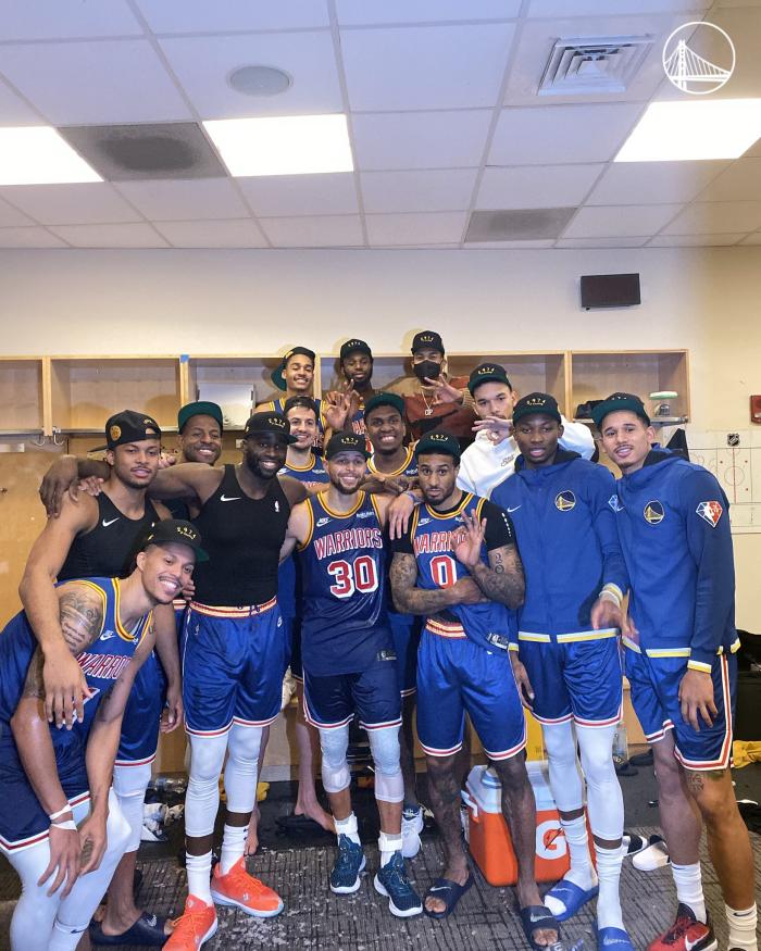 勇士更衣室合影庆祝!全队佩戴2974纪念帽, 库里C位出镜满脸笑容