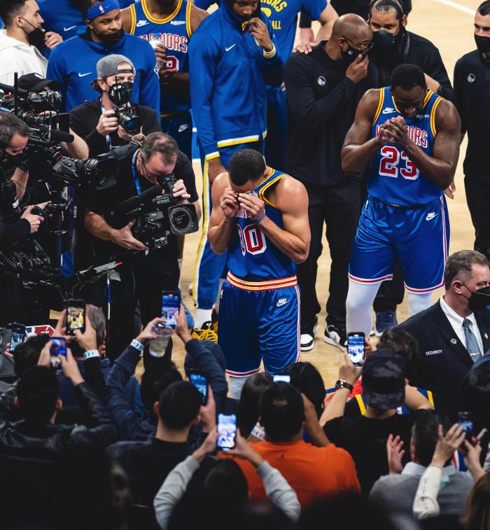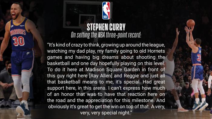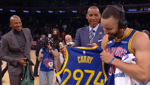 毫无疑问,今天库里是全世界的焦点人物,在篮球圣地麦迪逊花园球馆赢球并且破纪录,这注定是属于他的夜晚;库里不仅获得开场时的比赛用球,而且赛后获得一件印有“2974 库里”的纪念版球衣(米勒送给库里的),这个数字代表库里超越雷阿伦加冕历史三分第一人。