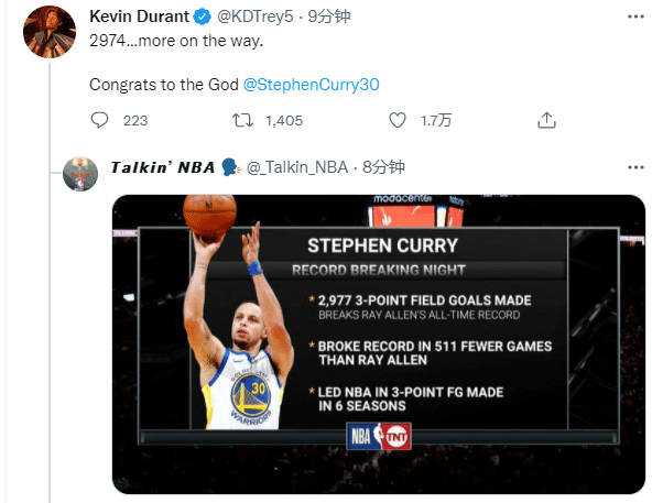回击斯基普-贝勒斯之后,杜兰特又发推恭喜库里加冕历史三分王,发推写道:2974,还有更多,恭喜三分之神库里。