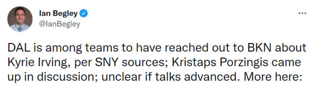 独行侠一直有兴趣在东契奇身边增加第二控球点,而欧文是一个理想的选择。波尔津吉斯和欧文的薪金是可以匹配进行一对一交易的,波尔津吉斯本赛季的薪水是3165万美元,算上这个赛季,波尔津吉斯的合同还有三年,其中2023-24赛季是球员选项。欧文本赛季的薪水是3491万美元,算上这个赛季,欧文的合同还有两年,2022-23赛季是球员选项。