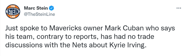 来源:JRS直播网12-15 11:54JRS直播网12月15日讯 ,据纽约记者Ian Begley报道,篮网对交易欧文持开放态度,而独行侠是已经和篮网取得联系的球队之一,他们有兴趣通过交易得到欧文。据悉,2米21的波尔津吉斯在独行侠提供的报价名单中,Begley表示,他还不清楚目前双方的谈判是否已经有了新的进展。不过,名记斯坦恩跟进报道称,库班否认自己的球队和篮网有过交易谈判。