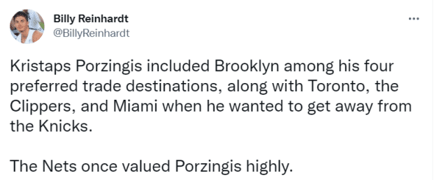 篮网记者Billy跟进报道称,波尔津吉斯当初想要离开尼克斯时,曾列出四支他想前往的球队,分别是猛龙、快船、热火和篮网。篮网当时也曾希望得到波尔津吉斯。