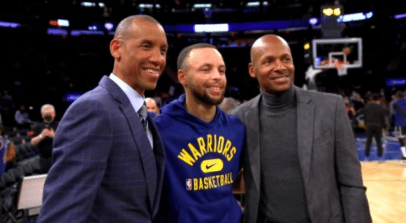 在打破纪录之后,库里在全场迂回,和重要的伙伴拥抱和致意,其中就包括了自己的爸爸、雷阿伦等人。值得一提的是赛前三大传奇合影,其中榜单中第三名的雷吉-米勒此役担任现场解说员,雷-阿伦今天被库里超越,3人在一起进行合影,这是历史性的时刻。同时库里的爸爸、勇士GM鲍勃-迈尔斯等人都来到了现场,看到了库里打破雷阿伦的三分球纪录,荣耀时刻。