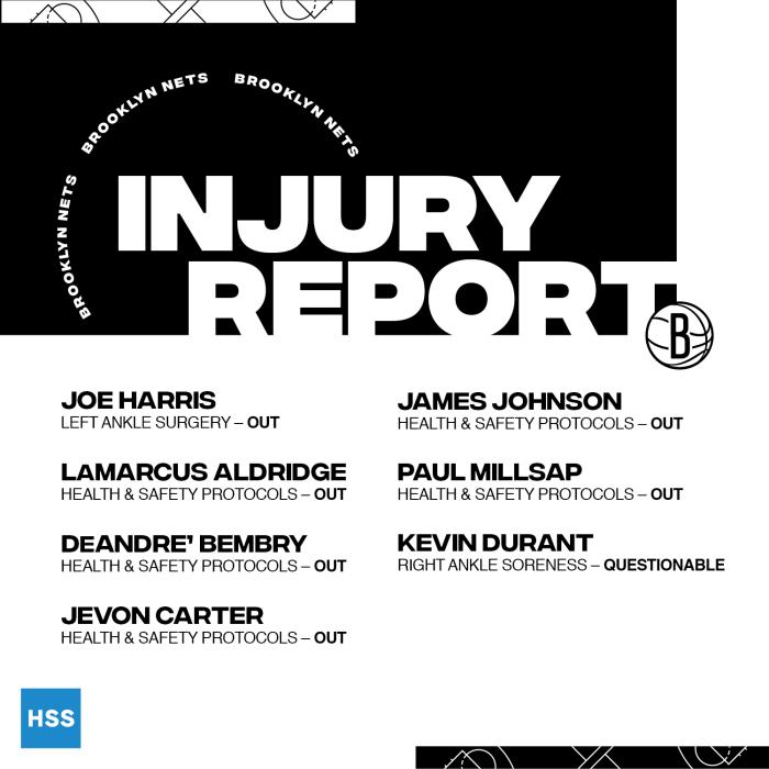 湖人遭疫情侵袭,布鲁克林篮网的情况更糟糕,全队已经有5名球员触发防疫协议,米尔萨普之后又新增四名球员,他们分别是阿尔德里奇、本布里、杰文-卡特和詹姆斯-约翰逊,他们5人都确定缺席今天的比赛,篮网还官宣杜兰特右脚踝酸痛,被列出出战成疑。