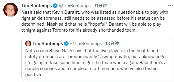 据纳什透露,篮网队不仅多名球员触发防疫协议,还有几名教练组成员和工作人员也中招了;杜兰特右脚踝酸痛也无法休战,他将带伤出战猛龙,这也是纳什希望的,因为篮网太缺人手了。