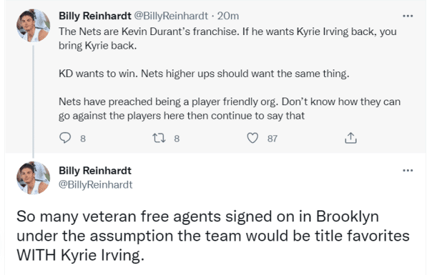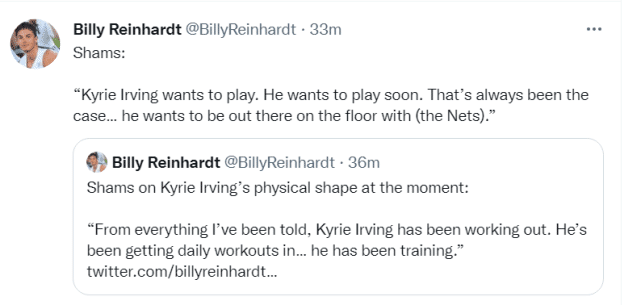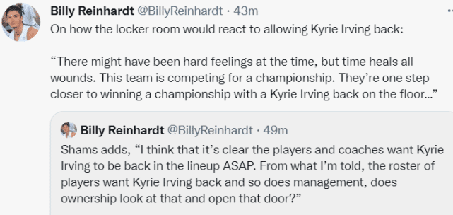 “过去几周,事情发生了变化,实际上是过去几天,人们对他本赛季重返球队变得更加乐观起来,”查拉尼亚在节目上说道,“怎么会这样?是他最终接种疫苗吗?是球队愿意让他打客场吗?其实是他和杜兰特之间的沟通不断增加,这种乐观情绪在感恩节前后开始了。”据我所知,队内球员都想要欧文回来,管理层也是如此,现在的关键在于老板是不是这么认为,而且是否愿意打开那扇门