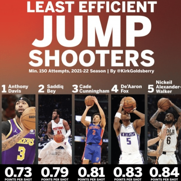同时本赛季浓眉哥的命中率是52.3%,看起来是非常不错的数据,但要知道的浓眉哥本赛季的中投并不是很好,堪称是来到湖人之后的最低值。在本赛季跳投得分最低效球员排名前五的球员,至少150次跳投出手,浓眉哥是0.73分/出手。