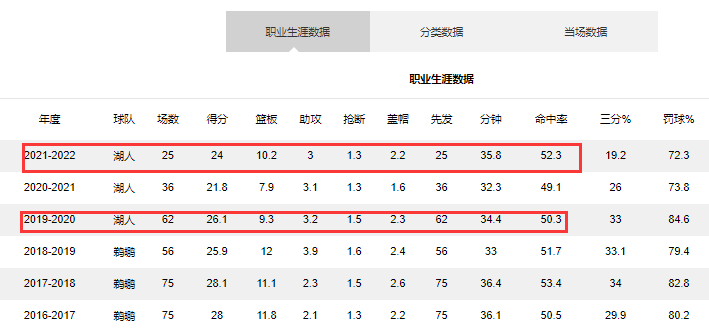 数据变化不大,但命中率却有直接的体现,来到湖人夺冠赛季,浓眉哥的三分球命中率是33%,但本赛季只有尴尬的19.2%,这也是浓眉哥最近7个赛季的新低,罚球命中率是72.3%,职业生涯最低。