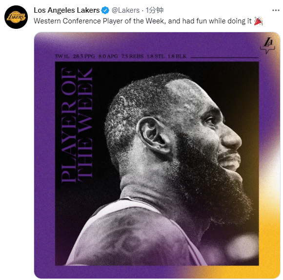 詹姆斯65次周最佳历史第一,时隔554天再获奖!湖人官方晒照祝贺