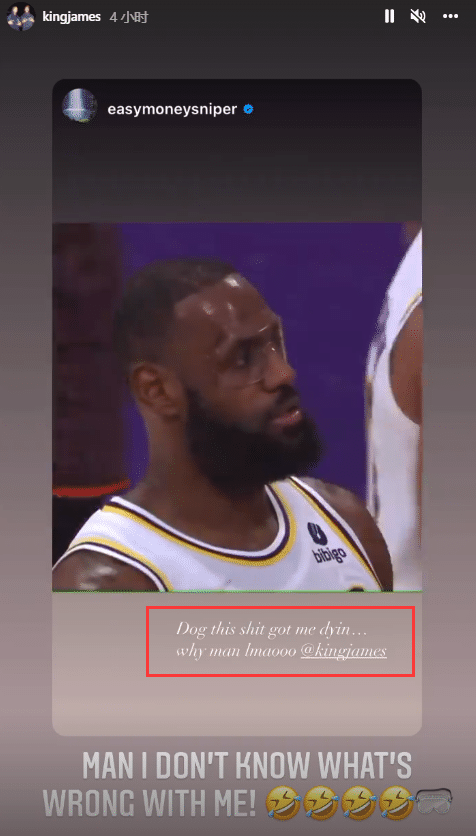 此前杜兰特也调侃詹姆斯,转发这一幕并配文写道:我笑死了,兄弟你为啥那么好笑;之后詹姆斯回应杜兰特:哥们,我也不知道我有啥毛病(4个笑哭表情)