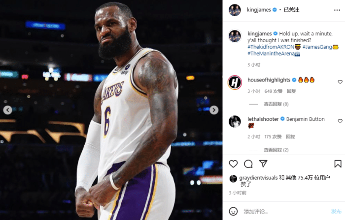 詹姆斯还晒照回应质疑,晒出赛场扣篮和握拳庆祝照,配文写道:等等,先别急,你们都以为我彻底不行了吗?#那个来自阿克伦的小孩#詹姆斯帮 #身处竞技场之中的人。