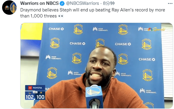 那么库里生涯三分总命中数能超越雷阿伦多少球呢?格林表示只要库里再进两记三分,破纪录就算翻篇了,我会非常开心,而且我认为库里会比阿伦多进一千个三分,所以,我会很开心。