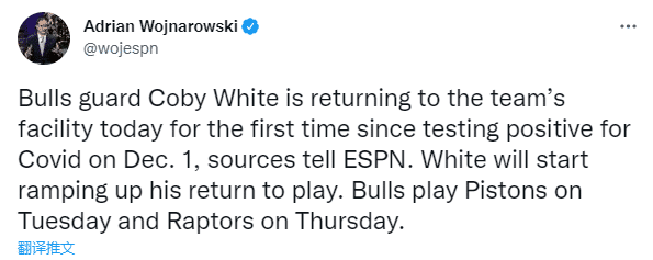 NBA遭遇疫情的侵袭,芝加哥公牛队已经成为联盟最惨的球队,一度多达9名球员触发健康安全协议,有可能因无法凑够8名球员出战而被迫推迟比赛;不过公牛后卫科比-怀特已经解除隔离,自从12月2日确诊新冠后,他已经首次重返球队,将加快复出的进度。