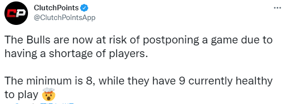 除了8名球员被隔离,帕特里克-威廉姆斯因手腕伤势无法出战,队内能够上场的球员还有9人(算上公牛用困难特例签下的麦金尼),美媒ClutchPoints发推写道:最低要求是8人出战,目前公牛有9人可以出战,由于球员短缺,公牛队面临着推迟比赛的风险。