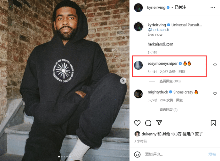 欧文在Ins上宣传他的服装品牌,晒出多张身穿该品牌运动装的照片,配文写道:普通追求,现在生活;对此杜兰特在评论区留言两个火的表情,表达了对欧文的支持。