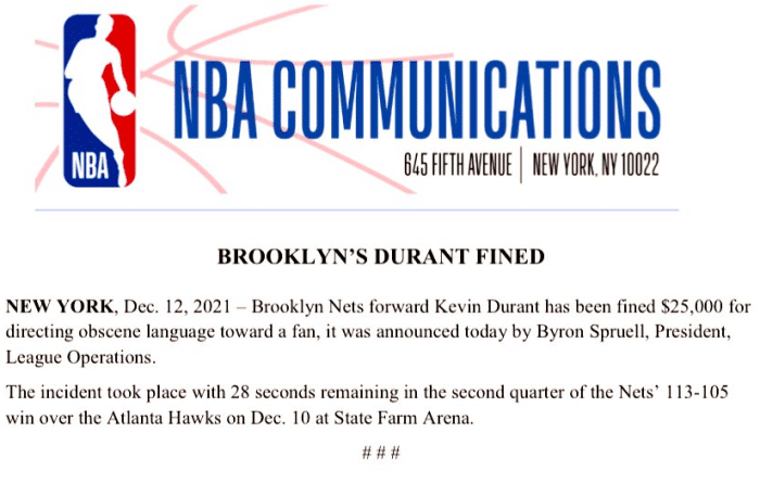 杜兰特因骂球迷被罚2.5万美元!评论欧文最新动态 力挺兄弟搞事业