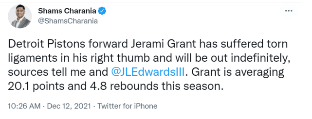 格兰特受伤,也让他不大可能再被球队交易。此前,活塞曾和76人进行接触,希望用格兰特为主的筹码去交易西蒙斯,但76人没有通过,现在,格兰特已经受伤无限期休战,他更不能被用来换西蒙斯了。活塞的重建希望,变得更加黯淡。