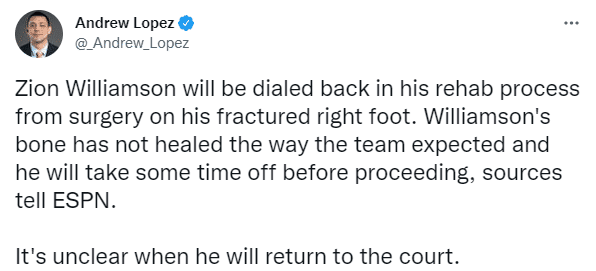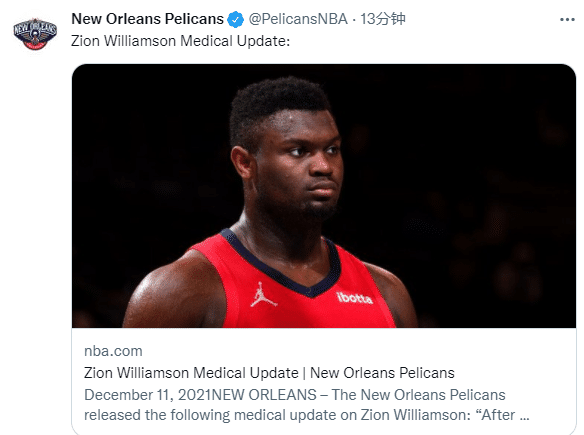 之后鹈鹕随队记者报道,锡安-威廉森将会从右脚骨折的手术中康复。消息人士告诉 ESPN,威廉姆森的骨头没有按照球队预期的方式愈合,他将继续休息一段时间。 目前还不清楚他何时能重返赛场。