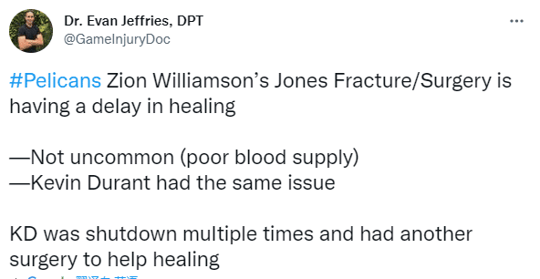 对于的锡安的伤情,医学专家Evan Jeffries跟进报道,锡安骨折愈合延迟,这种供血不足的情况并不少见,凯文-杜兰特也有过同样的问题,KD多次推迟复出并进行另一次手术才康复。
