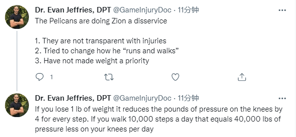 医学专家Evan Jeffries分析锡安的情况,发推写道:鹈鹕做的事对锡安不利,一是锡安的伤情不透明;二是鹈鹕试图改变他“跑和走”的方式;三是没有优先考虑体重。