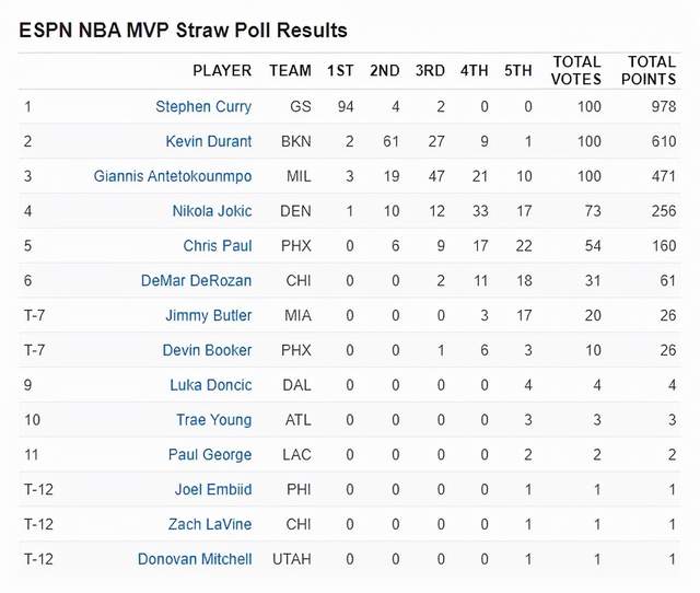 ESPN举行MVP模拟投票:库里94张第一选票领跑,詹皇首次没有得票