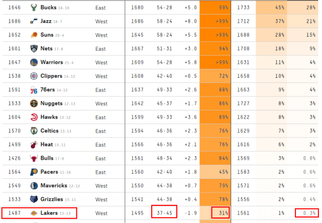 由于湖人余下赛程更为艰难,FiveThirtyEight预测湖人的最终战绩是37胜45负,只有1%的概率打进总决赛,0.3%的概率夺冠。