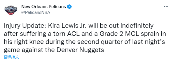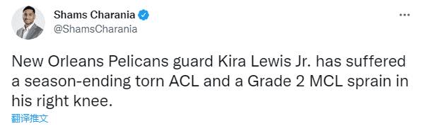 来源:JRS直播网12-10 10:26JRS直播网12月10日讯 ,鹈鹕官方宣布,核磁共振检查结果显示,球队后卫小凯拉-刘易斯遭遇右膝前十字韧带撕裂和内侧副韧带二级拉伤,无限期缺阵,名记shams表示刘易斯赛季报销。