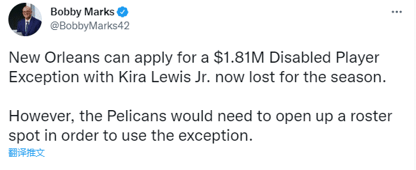 薪金专家Bobby Marks跟进报道,凯拉-刘易斯赛季报销, 鹈鹕可以向联盟申请一个价值181万美元的伤病特例,但鹈鹕需要腾出一个名额才能使用这个特例。