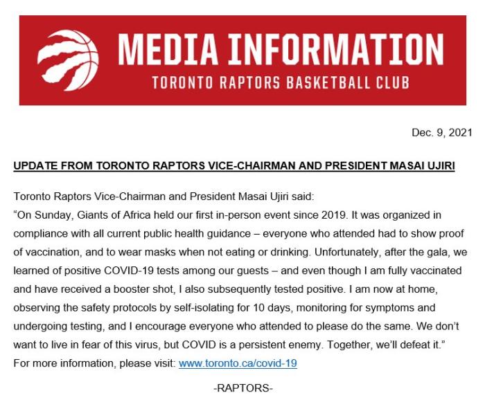 猛龙官方声明:猛龙队副主席兼总裁乌杰里参加了一次活动,它是按照所有防疫规定举办的,每个参加的人都必须出示疫苗接种证明,并且要佩戴口罩。不幸的是活动结束后,有人检测呈阳性,虽然我已经完整接种了疫苗,并且注射了加强针,但依旧被检测为阳性。我现在在家里接受为期10天的隔离,希望和我一同出席活动的人们也能这么做。