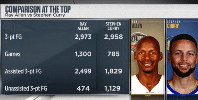破纪录进入倒计时,数据对比库里完胜雷阿伦,历史第1射手无悬念