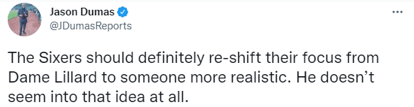 其实,今年休赛期就有关于利拉德可能申请离队的流言,当时利拉德曾回应绝对不会申请离队;现在利拉德再次表明态度——我不会申请交易;对此名记Jason Dumas发推写道:76人绝对应该把注意力从利拉德身上转移到更现实的人身上了。