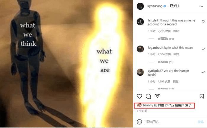 值得一提的是,詹姆斯大儿子布朗尼为欧文点赞,总共将近有25万人为他点赞。