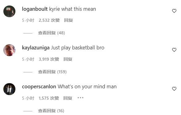 有球迷在评论区写道:凯里这是什么意思啊?还有球迷说——“只要好好打球就行了”“欧文你脑子里到底在想什么?