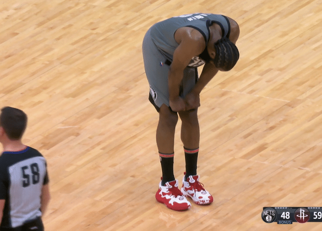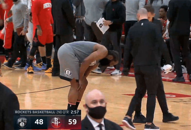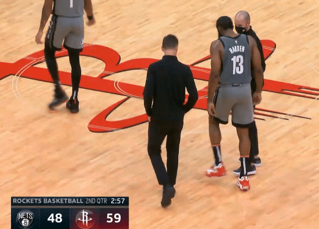 哈登崴脚险些受伤,双手扶膝太痛苦 纳什陪他走回替补席